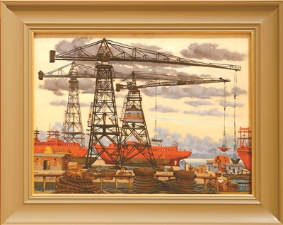 經典作品《巨臂》就是一個典型例證。這件作品依據在大連造船廠的寫生資料創作。畫面描繪了三臺矗立于港口的起重機,它們形態相同,卻因巧妙的布局在畫面中各具姿態。更為精妙的是,許幸之將色彩鮮艷的橙色大船置于起重機之后,并未展現全貌。常人或許不會以如此平視的角度刻畫這三臺起重機,更不會想到將大船作為背景。而許幸之巧妙的構圖視角,正是其創作的獨具匠心之處。