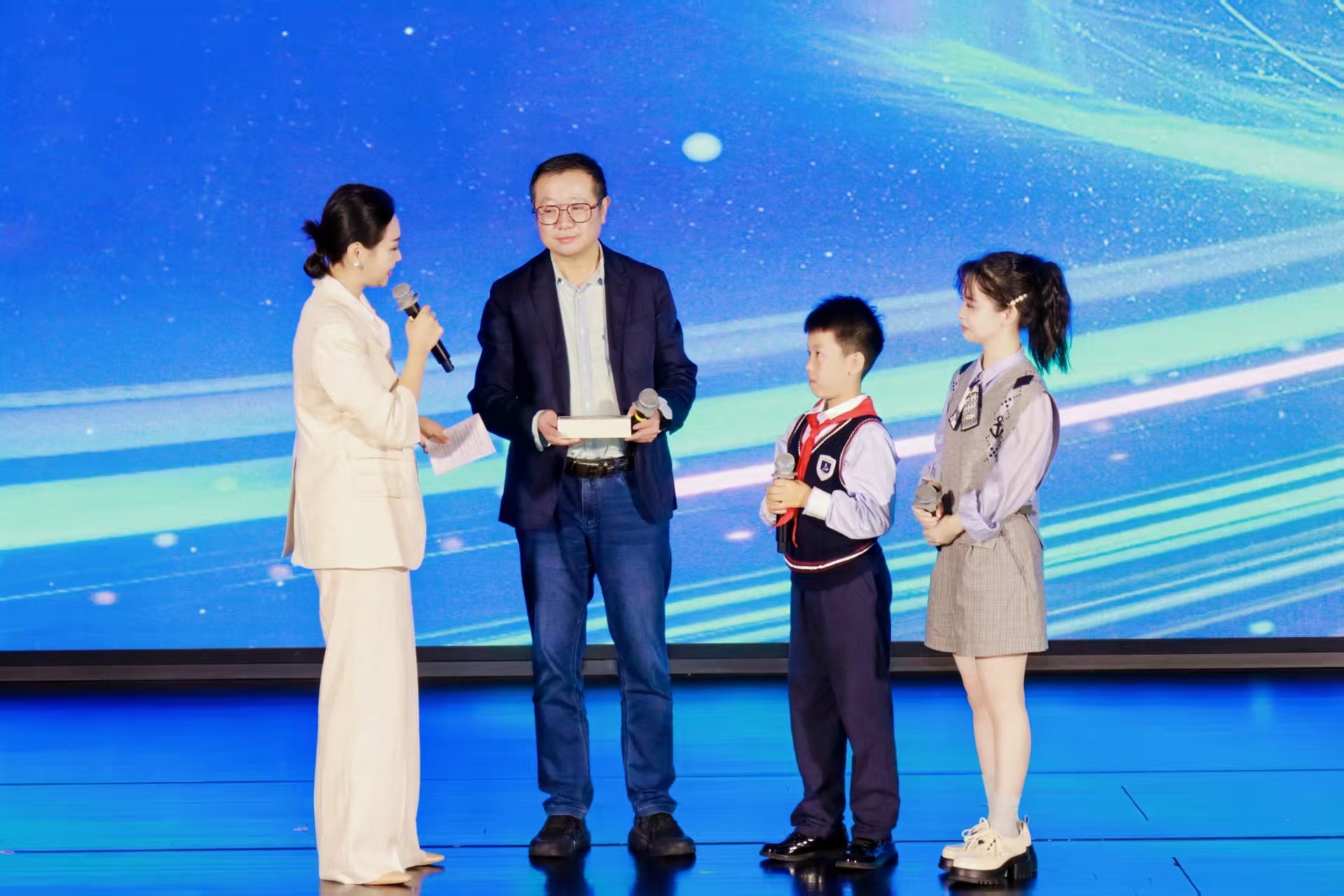 劉慈欣與到場讀者進行了熱烈的互動交流,與小讀者互贈禮物,現場還播放了讀者使用AI制作的劉慈欣作品視頻,昆山大學的學生演繹了科幻短劇。