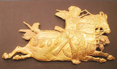 吐蕃騎射武士形飾牌造型威武,動感十足,格外引人注目。騎者纏頭巾,頭巾下方兩條發辮隨風飛舞,雙目圓瞪,嘴下有濃密的絡腮胡須;身穿緊身三角形大翻領長袍,雙手拉弓欲射,腰部系帶,其上垂掛箭囊,腰后露出刀柄。馬尾打有結扣,杏葉凌空飛動,氣勢撼人。金飾牌背面殘存帶黑漆皮的薄木片,上面有金釘將飾牌與木片定綴在一起,可知此飾牌原來應為某件木質器皿上的裝飾物?!斑@件飾牌的造型受到西亞薩珊王朝金銀器上的帝王狩獵圖影響,而騎士的裝束卻是吐蕃風格,體現了文化的交融?!壁w婧說,青海省都蘭縣熱水墓群出土了相似的騎射形金飾片,亦為吐蕃時期的器物。