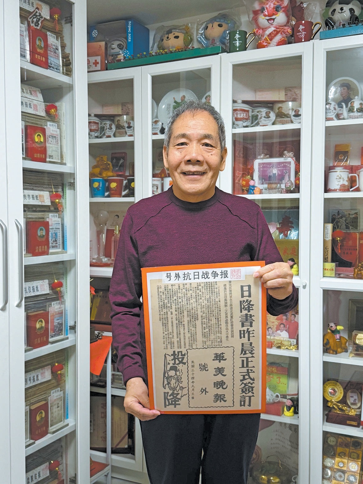 今年夏天,李鐵光又忙著辦起了“紀念中國人民抗日戰爭暨世界反法西斯戰爭勝利80周年”報展。他從400多份抗戰相關報紙中精選出280份,其中1945年9月3日的《華美晚報》號外格外引人注目,紙頁上“日降書昨晨正式簽訂”的標題,成了最有力的歷史見證。開展當天,不少家長帶著孩子來參觀,李鐵光站在報紙前,給孩子們一一講述?!拔覀円涀∵^去,才能珍惜現在的好日子?!崩铊F光說。