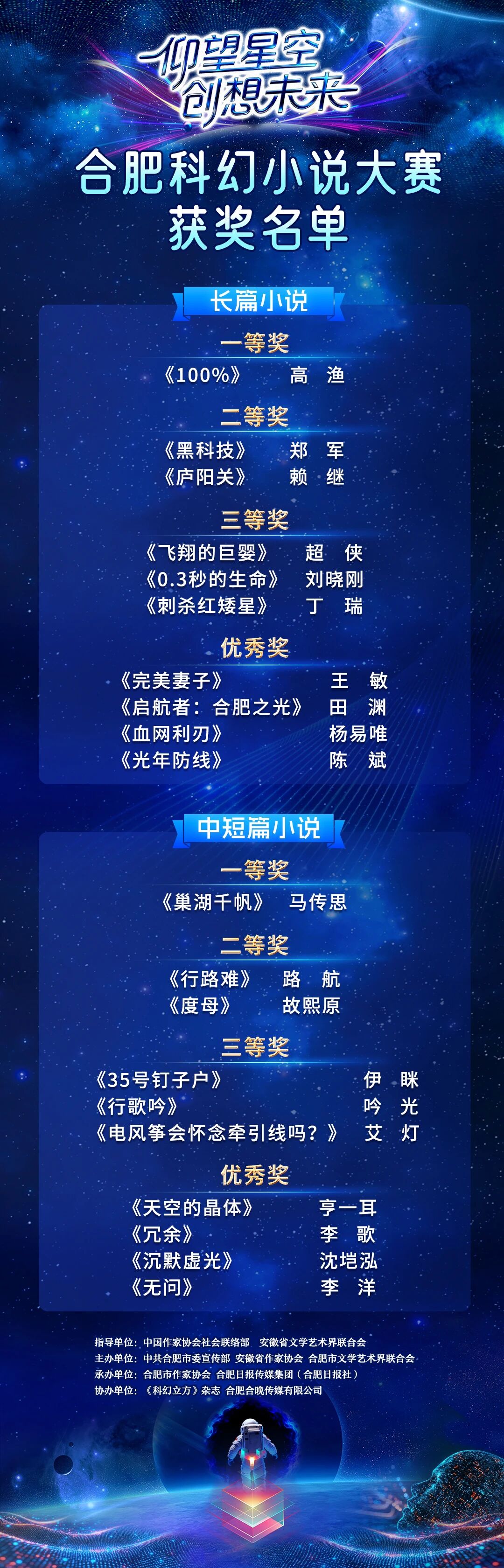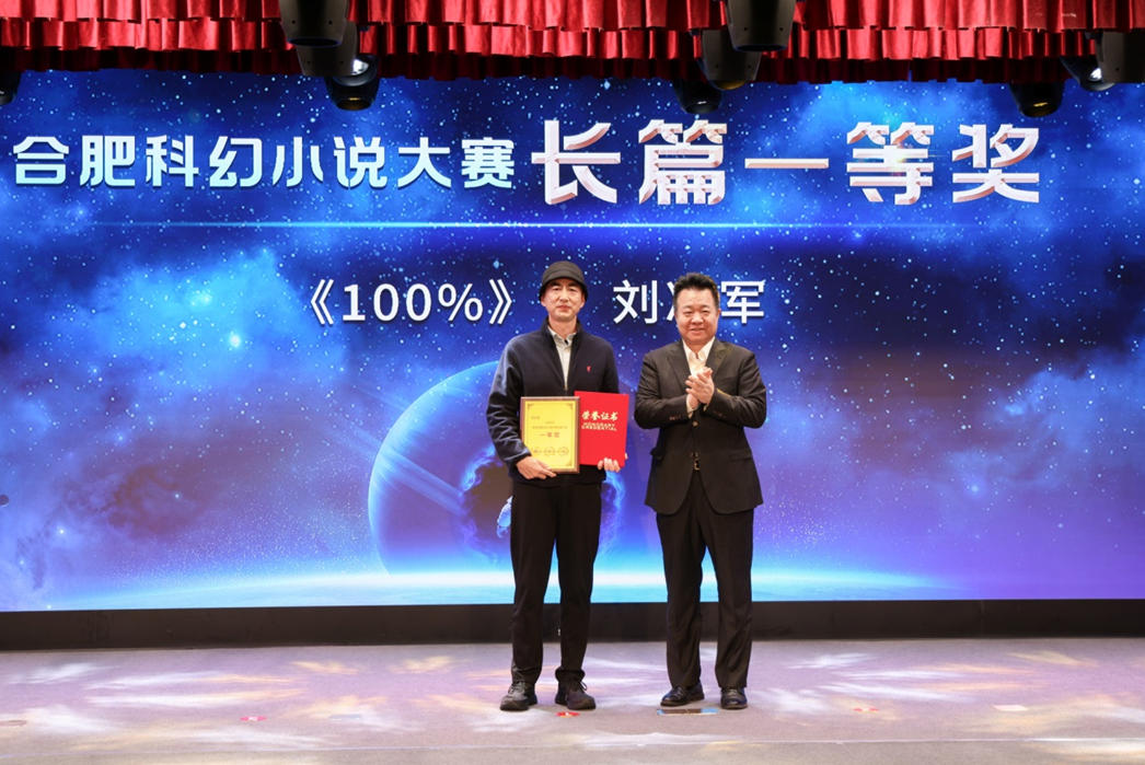 本次合肥科幻小說大賽以“仰望星空 創想未來”為主題,經過近半年時間征集,收到投稿作品1349部,共8000余萬字,無論是參賽人數,作品質量,參選范圍,都遠超預期,內容涉及到星際探索、時空穿越、科技倫理、未來社會等多個科幻維度,通過層層篩選,嚴格評審,最終20部佳作脫穎而出。其中劉涼軍(高漁)的《100%》榮獲長篇小說一等獎;鄭軍《黑科技》、賴繼《廬陽關》榮獲長篇小說二等獎;超俠《飛翔的巨嬰》、劉曉剛《0.3秒的生命》、丁瑞《刺殺紅矮星》榮獲長篇小說三等獎;王敏《完美妻子》、田淵《啟航者:合肥之光》、楊易唯《血網利刃》、陳斌《光年防線》獲長篇小說優秀獎;馬傳思《巢湖千帆》榮獲中短篇小說一等獎,路航《行路難》、故熙原《度母》獲中短篇小說二等獎;伊瞇《35號釘子戶》、吟光《行歌吟》、艾燈《電風箏會懷念牽引線嗎?》獲中短篇小說三等獎;亨一耳《天空的晶體》、李歌《冗余》、沈塏泓《沉默虛光》、李洋《無問》獲中短篇小說優秀獎。