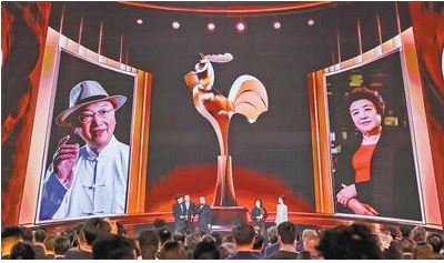 第三十八屆中國電影金雞獎頒獎典禮舉行,83歲的一級演員喬榛、84歲的一級導演肖桂云(右)獲頒中國文聯終身成就獎(電影)。