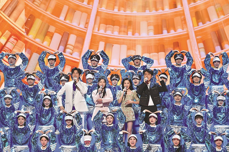 來自甘肅省甘南藏族自治州臨潭縣的6名小朋友與演員萬茜、芒果少年合唱團共同演唱歌曲《最好的未來》 馮海文 攝