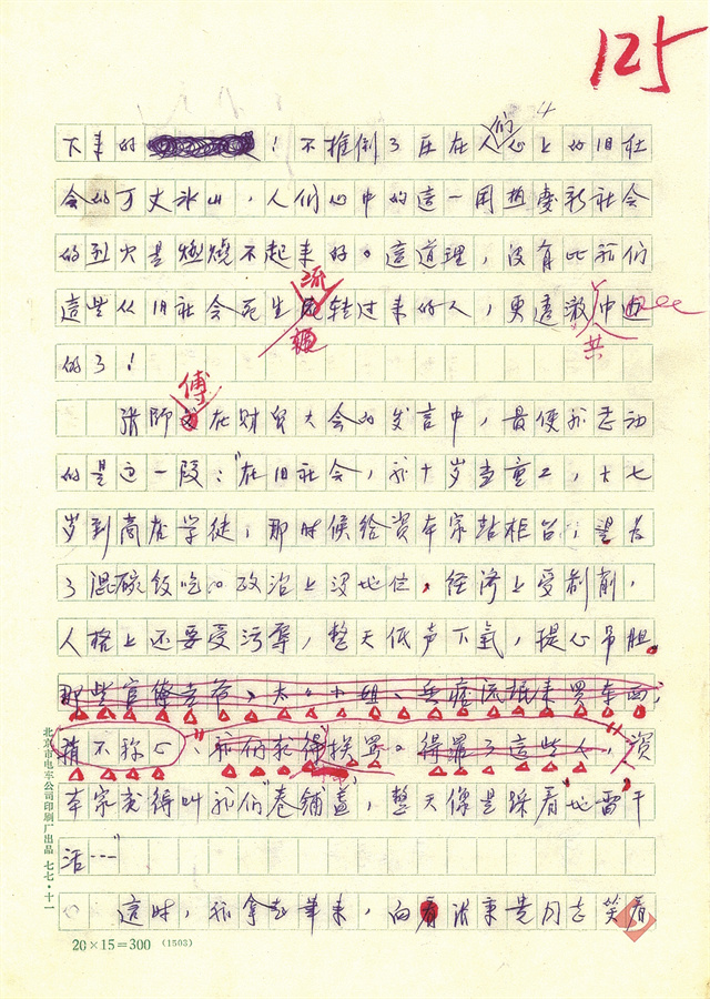 1978年7月13日,《頌“一團火”》完成。7月17日,周明在稿箋上概括了這篇作品的一些特點,“文章順著報紙‘一團火’的路子,主要追究‘火’從何而來,多半篇幅寫了舊社會張師傅的苦難生活”,并且“大量引用了群眾給張師傅的來信”??傮w而言,該作品的特點是親切生動,感情充沛,引用大量青年來信使文本產生了鮮明的“對話感”,也極具生命力,有著較為獨特的情感質地。原稿為7000字,由周明作了一些刪改后,壓縮為6500字。這些留存于手稿與稿箋之上的思考與文字修改痕跡,展現的是作品從底稿到刊發的生產過程,也是報告文學在新時期火熱的生產現場的忠實記錄,以及對時代脈搏的深情應和。手稿的價值恰恰在于它所保留的、被定稿所掩蓋的“多聲道”敘事。手稿定格了1970年代末的時代話語和語言風貌,“全國財貿學大慶學大寨會議”之類的政治短語、“同志”“師傅”的選用,是政治話語與文學表達關系的見證。被刪改的部分作為一個未盡的“潛在文本”,存在于手稿之上,為讀者和研究者提供了想象文本的空間。