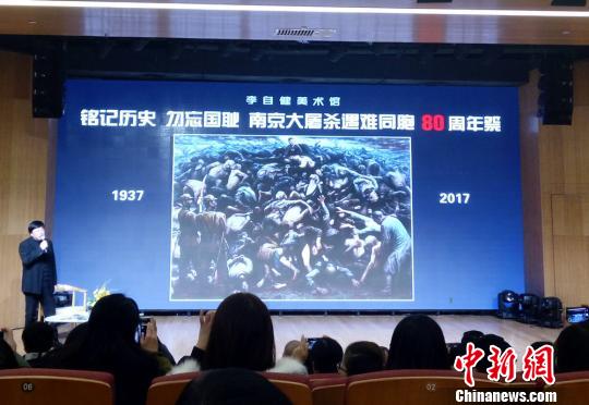 12月13日是南京大屠殺死難者國家公祭日。當天,旅美畫家李自健在長沙李自健美術館與參觀者分享了自己創作巨幅歷史油畫《南京大屠殺》的緣由和該畫全球巡展故事,以此緬懷遇難同胞。